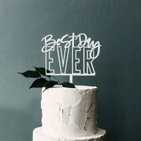 Enhance your wedding day with a touch of elegance using Satin Pavement's laser-cut wood Best Day Ever cake topper. This unique, statement-making piece is perfect for commemorating your wedding day and adding a sophisticated and personalized finish to your wedding cake.